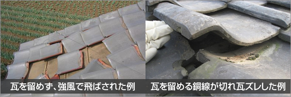 瓦を留めていないと強風で飛ばされたり、瓦を留めている銅線が切れて瓦ズレを起こしたりします。